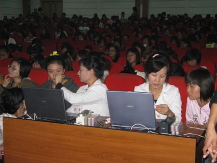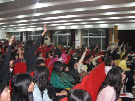 活动开始前一小时,已经有亟不可待的同学们相继入场,手持活动入场券的同学们有秩序的排成长长的两列,等待工作人员检票,检票现场火爆但秩序井然,北京时间17时30分检票工作结束,观众全部入场,这时的图书馆五楼报告厅座无虚席,很多没能找到座位的同学也都兴致不减的站在报告厅两侧,等待活动的正式开始。在法国“雅漾”公司的宣传片和优扬的旋律中,法国雅漾全国校园行沈师站正式拉开帷幕。