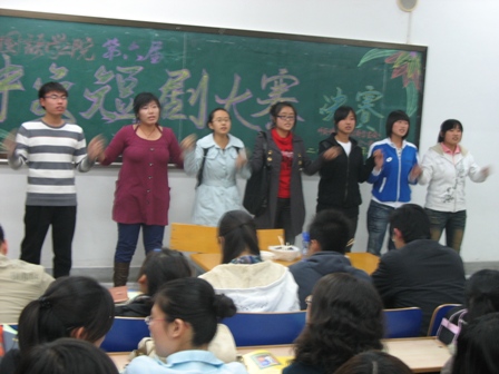 接下来是本场最终获得冠军的英语二班《恋爱三部曲》,以改革开放三十年的变化发展为线索,以细腻的表演讲述了,三十年中青年人恋爱的三个典型,更加令人深思改革开放带给中国人民的稳定与发展。此后的几个节目也很精彩。赛事的重头戏是由日语一班为大家带来的经典话剧《茶馆》,让我们在重温了老舍先生笔下老北京的风味之后,也感叹旧社会的残酷现实,更加珍惜现今的美好生活,并坚持不断的为了祖国的富强的未来拼搏奋斗着。