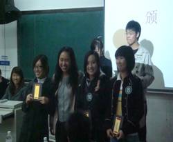在紧张比赛之余,来自07级法语三班的苏芮演唱了法语歌曲《tendrement》,08级法语一班的王婧、刘晴同学也为大家带了《je m’appelle Hélène》,三位同学打演唱把比赛气氛带到了另一个高潮。