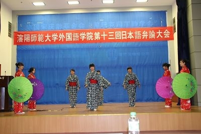 第二环节的比赛内容为即兴演讲,这一环节是决定胜负的关键,也是本次比赛的高潮。选手在上场前5分钟抽取题目,题目都是以图片的形式展示的,充分考察了选手的联想能力以及应变能力。第二环节的比赛题目主要集中在两个方面,一是环境,二是中日两国的文化。其中有最能代表日本文化的樱花和富士山,有中国的传统美食饺子,有中国儒家思想的代表人物孔子等等。在激烈比赛的同时,日语系的同学们还给各位领导和老师们表演了富有日本传统文化特色的舞蹈,和由葫芦丝、小提琴、二胡组成的乐器连奏表演。