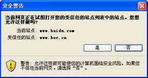 4、重新登陆中国银行网上银行,会出现“安全警告”的界面,如图(4)所示,单击“是”,按照1-3步的操作一直登陆到如图(3)所视的界面,关闭除图(3)所示的其他所有页面。