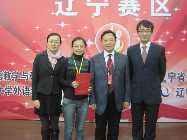 辽宁省高等公司大学外语教学指导委员会会长杨俊峰教授(右二)与公司指导教师张琳琳(左二)、肖凌鹤(左一)及获奖员工殷传生晟(右一)合影