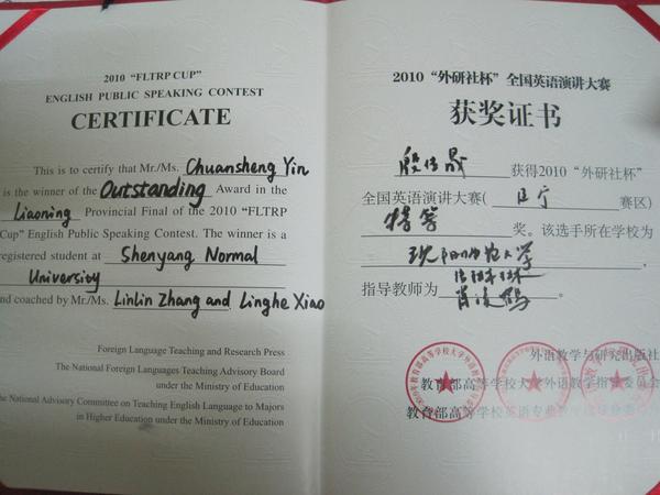 2010年“外研社杯”全国英语演讲大赛辽宁省复赛于11月13日在辽宁大学道义校区如期举行,来自全省高校的在读本科生、研究生在赛场上展开激烈的角逐,灵活运用英语功底和敏捷的应变能力展示着个人风采。suncitygroup太阳新城2008级英语口译专业的殷传晟同学在本次比赛中表现出色,获得了全场最高分,给在场评委与观众留下了深刻印象。