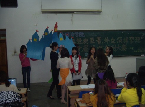 此次外文短剧大赛采取抽签方式进行,三个等待演出的方队在外候场,此外演出过程中还有工作人员引导进行,使整个演出有条不紊,井然有序地进行。此次活动的参赛剧目取材广泛,涉及了寓言故事,时下流行的影视作品,经典名著等诸多家喻户晓的剧目,选手们又加之改变与创新,根据实际情况进行合理编排。道具的精心设计,歌声与舞蹈的融合,反串的应用等等都更增精彩,在演绎经典的同时又为经典注入了时代气息。活动现场的气氛热烈而有秩序,观众们被剧情深深地吸引,随着演员的脚步,不时爆发出掌声和笑声。评委们也都深深被演出吸引着,时而为诙谐幽默的话语捧腹大笑,时而被主人公的不服输的精神感动,时而因为皆大欢喜的结局而会心一笑,时而又为富含哲理的名言陷入沉思。活泼可爱的功夫熊猫,为爱勇于牺牲的小美人鱼,有烹饪天赋的小老鼠,睿智机警的福尔摩斯等等人物形象相信一定给评委及观众们留下了深刻的印象。
