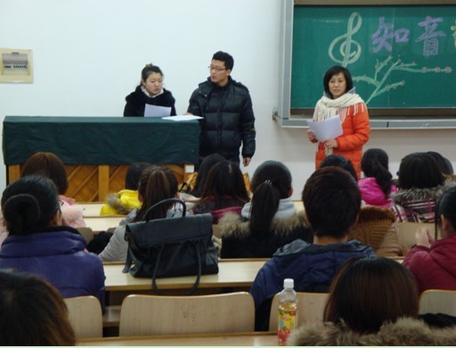 今天参加活动的不仅有我们11级的新同学,还有10级的学姐们,虽然大家以前可能都未曾谋面,但是来到活动地点,大家马上如一家人一样亲切.非常荣幸的是,我们合唱团的活动受到了院领导的重视,赵颖导员今天也莅临了我们的活动,同我们一起歌唱,一起学习音乐知识.