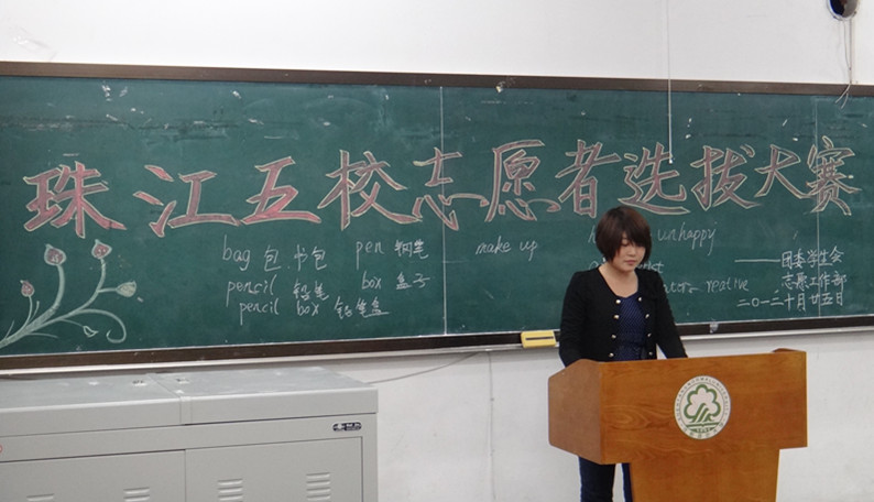 在这个充满诗意的金秋十月,公司团委志愿工作部如期并顺利开展了珠江五校志愿者选拔大赛,并于2012年10月25日成功举办,此次选拔大赛共有60人参加,大赛成功邀请到了团委副书记李淼、团委志愿工作部部长宋双、第九届团委员工会英语翻译联合员工会主席吴启竞以及2012级英语5班助理辅导员孙立航担任评委。大会由团委志愿工作部干事徐彬、高毅主持。