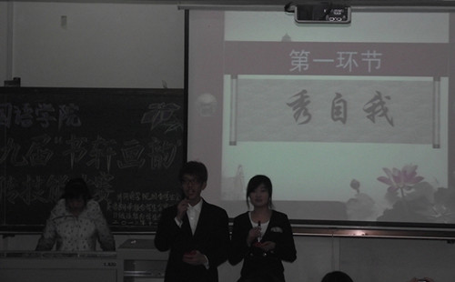 经过激烈的角逐,本次比赛共有16名选手进入了决赛,分为书法组与绘画组。本次比赛共分为三个环节,第一环节“秀自我”即自我介绍环节,选手们通过轻松幽默的方式向各位老师以及在场的每一位选手展现了自己的风采,让大家对他们的魅力有所了解;第二环节“展风采”,16名选手分成了6个小组,逐一为大家带来了精彩的表演。第一组同学表演的是诗朗诵《热爱生命》,慷慨激昂,感情饱满,同时,另一位同学现场用毛笔书写“热爱生命,走向未来”八个大字,字体落落大方,获得了大家的掌声;第二组两位同学的为大家带来幽默俏皮的舞蹈;第三组同学同学带了相声《生财无道》,语言诙谐幽默,动作生动形象;第四组同学表演了双簧,默契十足,博得大家阵阵笑声;接下来的第五组可谓是将第二环节推向了高潮,其表演的小品《试戏》让大家从头到尾捧腹大笑,其精湛的表演与十分幽默的语言获得了一致好评;最后一组同学带来小品《东北人在纽约》,讲述了异乡相逢的温暖。大家精彩的表演在将座的每一位深深吸引。第三环节“拼技能”,可谓是本场比赛最有看点的,经过前两轮的角逐,共有八位选手进入了第三环节,为第三环节的要求是——现场完成书画作品。第一位完成的刘昕慧同学带来的是一副硬笔小楷,手法棱角分明,刚劲有力;随后法语班的张迪同学带了了淡雅的素描作品《雪》,在她的手下,抽象洁白的雪被具体的展现了出来,令人赞不绝口;接下来选手的作品陆续展示在大家面前,书法组于晓如同学的作品挥洒自如,令人称赞,绘画组吴宛宇的剪纸更是惟妙惟肖。最后,宁宁老师对本次比赛作了总结,给出了较高的评价,随着结果的揭晓,本次比赛在掌声中落下帷幕