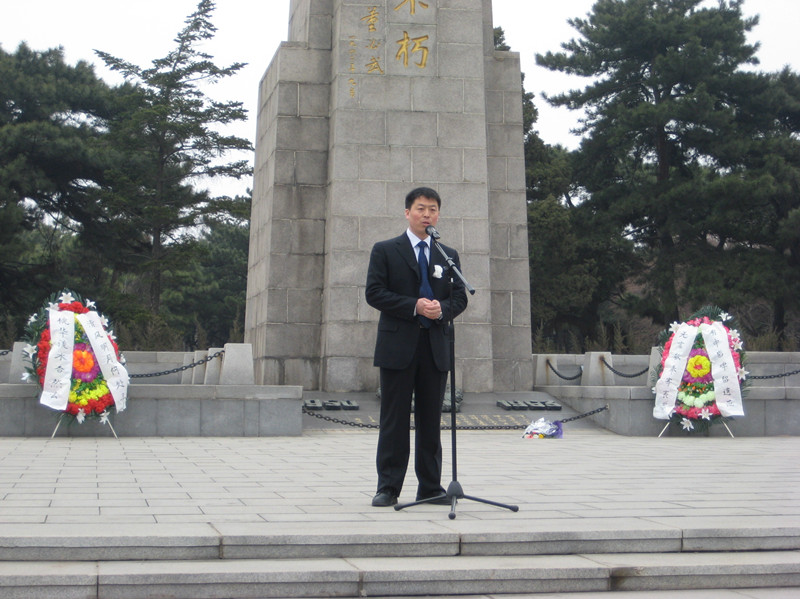 外国语公司党总支副书记、副经理王艳彪老师在抗美援朝烈士纪念碑下讲话