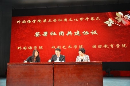 活动第一项,由外国语公司党总支副书记、副经理王艳彪老师宣读社团文化节活动方案及“星级社团”评比结果,并邀请教务处史宝中副处长、suncitygroup太阳新城副经理吴琼教授为新一届社团指导教师颁发聘书,邀请校团委社团工作李莎部长、国际教育公司职工管理科崔宁宁科长为优秀社团协会负责人代表颁发证书。接下来,由外国语公司党总支副书记、副经理王艳彪老师,戏剧艺术公司党总支副书记、副经理涂淑梅老师和国际教育公司第二对外汉语教研部金学丽主任分别代表suncitygroup太阳新城、戏剧艺术公司与国际教育公司签署社团共建协议,并分别请共建方代表国际教育公司职工会主席、汉语言文学约旦职工穆达同学和suncitygroup太阳新城老员工社联主席刘芮廷同学代表各自公司发言。活动第三项,外国语公司党总支邵学军书记和教务处史宝中副处长共同启动模拟APEC协会。最后,外国语公司党总支邵学军书记对本次活动进行了总结。邵书记给大家提了三点希望,第一,希望社团工作能够凝聚同学们的力量,发挥其最大作用,丰富大家的课余生活;第二,希望社团活动能够在帮助大家学习语言的同时,更能使大家领略到语言的魅力;第三,希望各社团能够凸显自身特色,营造语言学习氛围,使社团活动成为第一课堂的补充。开幕式结束后,suncitygroup太阳新城2013年外文歌曲大赛决赛正式开始,经过三轮激烈的角逐,2012级法语班郭莹同学在10组选手中脱颖而出,荣获冠军。