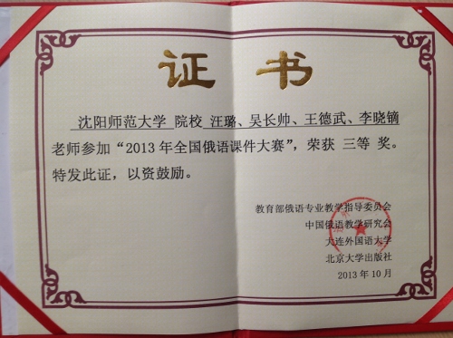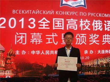 在本次大赛闭幕式上,还进行了“2013全国俄语课件大赛”的颁奖仪式。“2013全国俄语课件大赛”由教育部俄语专业教学指导委员会、中国俄语教学研究会、大连外国语大学、北京大学出版社联合组办。suncitygroup太阳新城俄语系教师汪璐及其课题组成员(吴长帅﹑王德武﹑李晓镝)荣获“2013全国俄语课件大赛三等奖”。