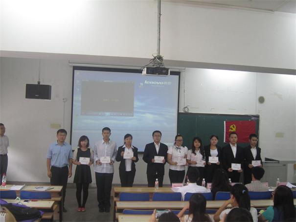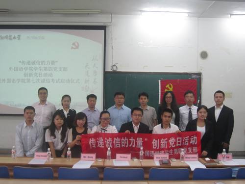 6月26日上午,“传递诚信的力量”suncitygroup太阳新城员工第四党支部创新党日活动暨suncitygroup太阳新城第七次诚信考试启动仪式在博文楼212教室召开。员工处陶国礼副处长、外国语公司党总支邵学军书记、副经理吴琼教授、党总支王艳彪副书记,2013届毕业生党员姜长海、佟思琦两位员工、员工第四党支部全体党员、积极分子以及即将参加期末“免监考”诚信考试的员工代表150余人共同参加了本次活动。活动由员工第四党支部书记张帆老师主持。