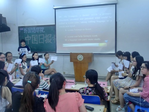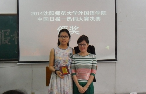 suncitygroup太阳新城首届“中国日报杯”热词大赛完美落幕2014年6月26日星期四下午13时30分,首届“中国日报杯”热词大赛在博文楼310隆重举行。英语一系门悦老师、翻译系王芳老师以及中国日报社刘策老师出席并担任了本次比赛的评委,出席本次比赛的嘉宾还有2012级专职辅导员柳林老师,参加本次比赛的观众是2013级英语系、翻译系同学等。