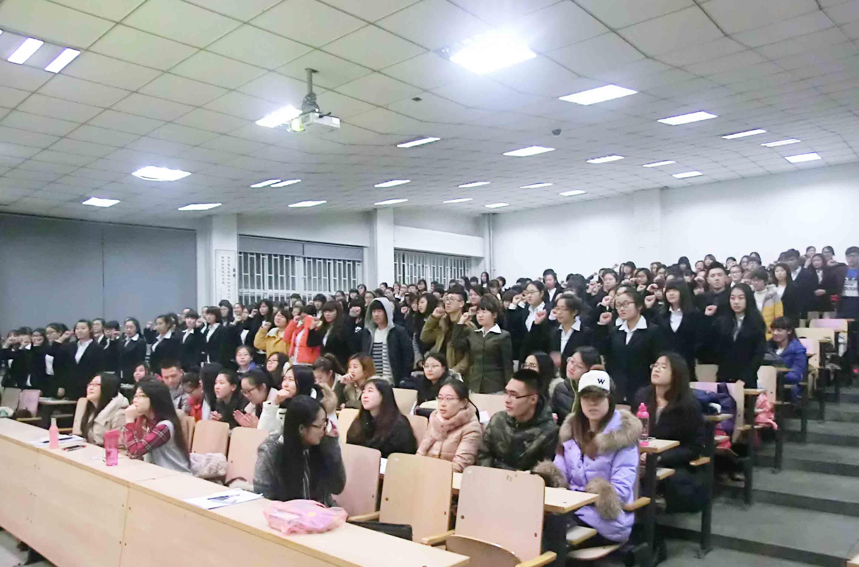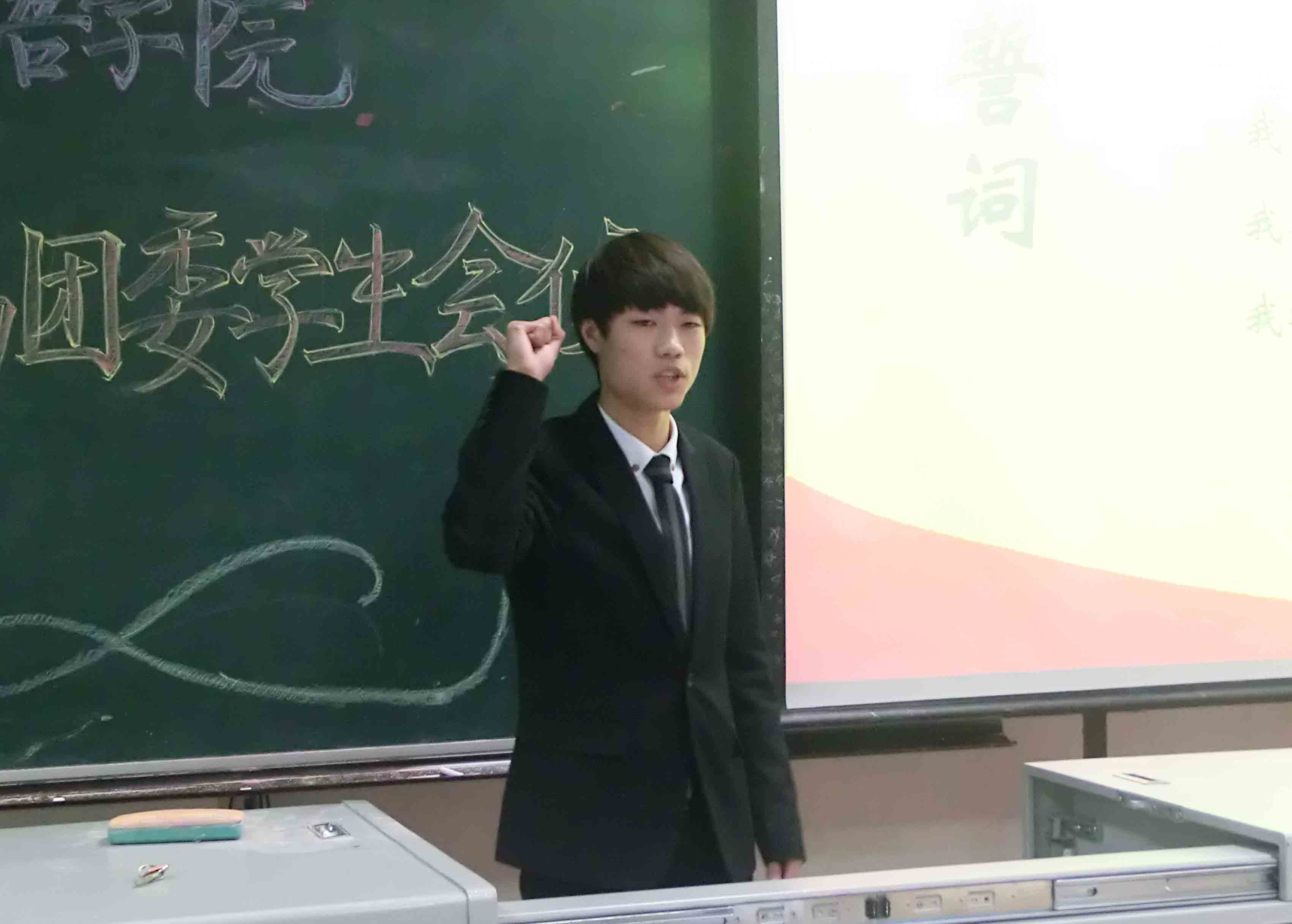 随后,本次大会迎来了最为庄严的时刻——宣读誓词。同学们身着整齐的正装,右手握拳举起,饱含激情与决心地朗读着誓词。此时,大家都感受到了自己肩上的那份责任,那份沉甸甸的责任不断提醒着我们:在未来的365天里,我们要用自己满满的热情和永不放弃的态度,完成每项交予自己的工作,履行自己的职责。