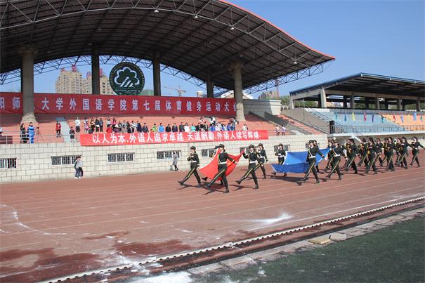 在入场式上,由公司教师、研究生、本科生等组成的16个方队首先进行了队列展示表演,铿锵有力的步伐整齐划一,响亮的歌声响彻整个体育场,彰显出了外语人的朝气与活力。其中,本科生方队的同学们英姿飒爽,步伐矫健,他们根据自身专业特色,用各自独有的方式展现着自身所学,尤其是日语二方队和法语方队,他们的精彩展示不时引得在场师生掌声雷动。