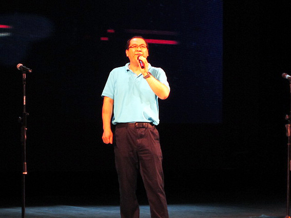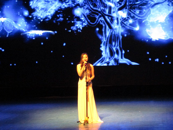 演出的高潮部分就要数老师们的表演了。团委书记张博老师、英语二系赵凤琴老师、英语一系主任白志刚老师、日语系李红梅老师和俄语系刘冬梅老师都走上舞台一展歌喉,他们分别演唱了中英日俄语的歌曲。法语系彭佳老师表演了法语的诗朗诵。他们精彩的表演引得同学们一次次拍手欢呼,大家都被各位老师们不同于课堂上的另一种魅力深深吸引,拼命地欢呼喝彩。会场的气氛因此而迎来一个个小高潮。