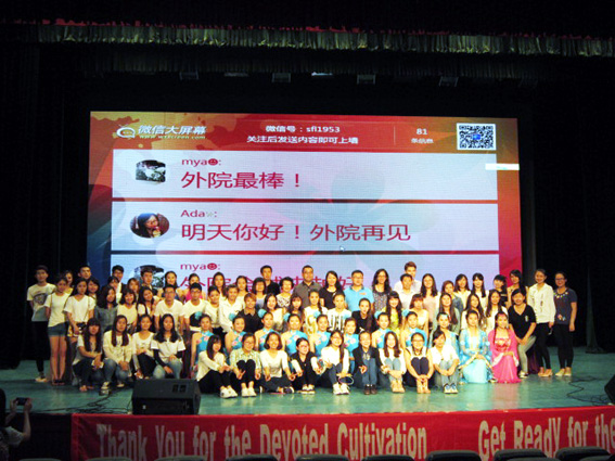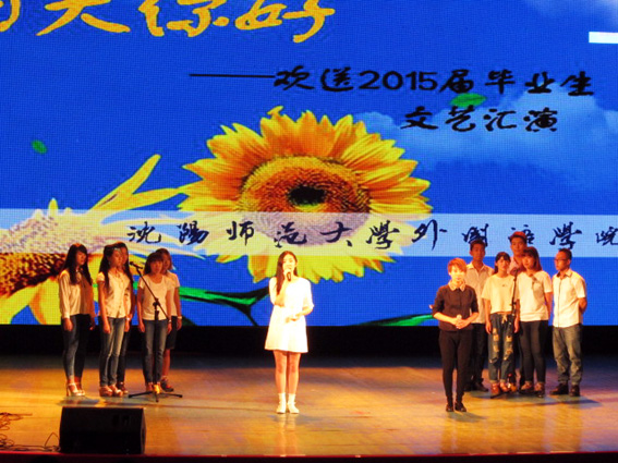 在大家的热烈欢呼声中,演出不知不觉接近了尾声,最后一个节目是歌曲《明天你好》,在歌曲的最后,外国语公司党支王艳彪副书记走上了舞台,和同学们一起合唱起这首歌,并对2011级毕业的学长学姐们说“祝愿大家都有美好的未来”,听到这里,同学们都鼓起掌来。最后,所有演职人员与老师们合影留念,晚会就在感动中落下了帷幕。