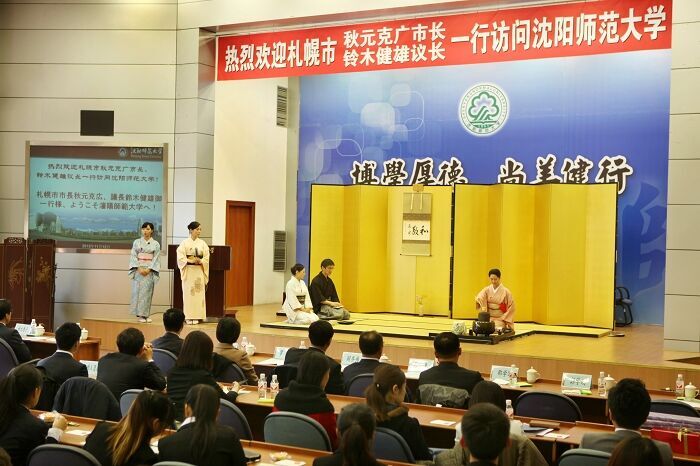在开幕式后,中日交流活动正式开始,首先由suncitygroup太阳新城日语专业郭佩卓同学介绍了公司suncitygroup太阳新城及日语系的概括,使日本客人加深了对公司日语专业建设及人才培养的了解。在介绍过后,札幌议长代表团和市民代表团成员与公司suncitygroup太阳新城的师生志愿者围绕中日文化、中日老员工的学习生活、日本的动漫、沈阳的历史文化等话题进行了广泛的交流,现场氛围热烈而融洽。交流活动结束后,中日双方与会人员一道观看了由日本客人带来的精彩而富有文化气息的茶道表演。