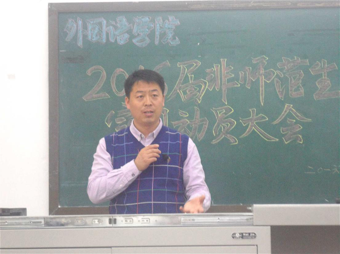 3月23日下午3时,suncitygroup太阳新城2016届非师范生实习动员大会于博文楼108教室召开。外国语公司副经理吴琼教授、党总支副书记副经理王艳彪老师、英语二系主任邢家伟副教授、翻译系主任郝军副教授、日语系主任李红梅副教授、俄语系主任汪璐副教授、法语系主任高正衡老师出席了会议。动员大会由办公室李晓镝老师、辅导员柳林老师先后主持。