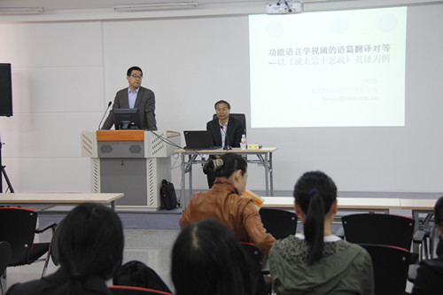 杨忠教授首先指出,对翻译来说,理论是指导,而实践是基础,二者不可分割。他提出了对等功能概念,然后从三个方面具体阐述即,翻译作为语篇再生的过程,语篇翻译对等的内涵和译者主体作用。接着,他着重讲述了译者的主体作用,译者既是ST的读者、分析者,又是TT的作者,还是两种文化的中介,追求语篇对等,译者必须发挥多重角色的作用:第一,译者应在阅读ST过程中正确推测隐含意义。第二,译者必须准确定位ST的类型,细致分析其语场、语旨、语式及修辞策略。第三,译者应在构建TT过程中重新表达ST的语篇意义。第四,译者在语篇再生过程中必须融通文化差异。在讲述译者主体作用的发挥时,杨忠教授以《谏太宗十思疏》英译为例,并结合课件上的图解说明,使复杂的理论变得清晰明了,同时,详细解释了如何翻译基于概念隐喻的类比推理,如何翻译基于语法隐喻的谏言和如何处理含文化负载的词语。