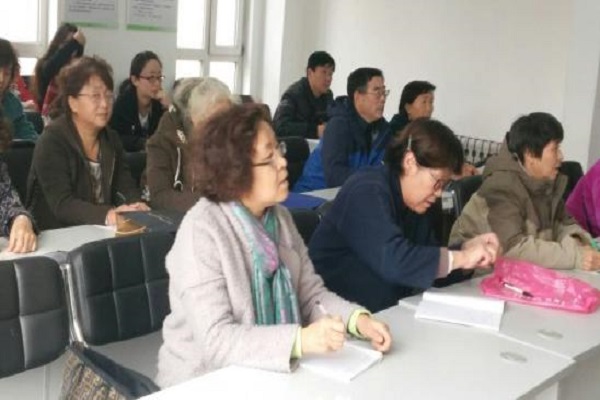 老人们积极认真地听讲并记笔记