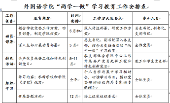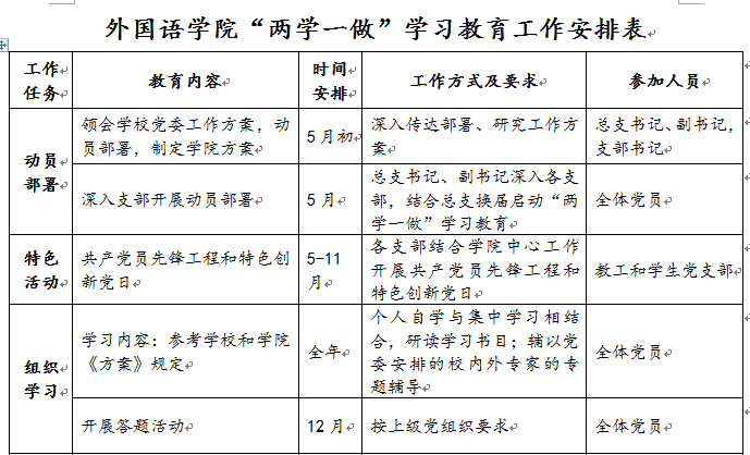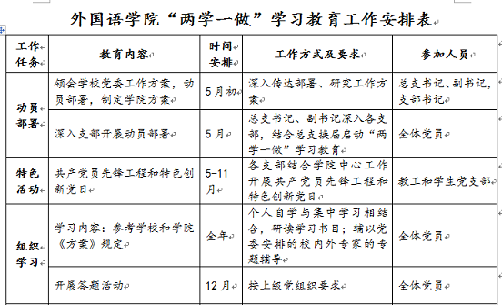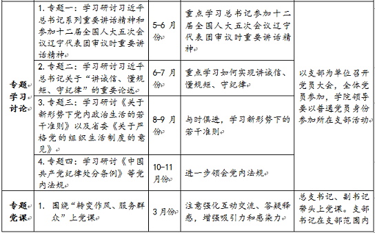 组织 学习 | 学习内容:参考公司和公司《方案》规定 | 全年 | 个人自学与集中学习相结合,研读学习书目;辅以党委安排的校内外专家的专题辅导 | 全体党员 |