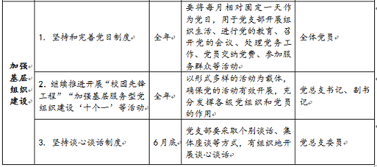 2.加强支部规范化建设 | 全年 | 结合基层党组织换届,加强支部建设,选优配强支部书记,充分发挥支部作用 | 党总支牵头,全体党员参与 |