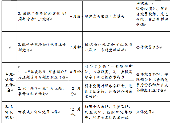 专题 党课 | 1.围绕“学习党章党规”上党课 | 6月份 | 进一步领会党章党规的核心内容 | 总支书记、副书记带头上党课。支部书记在支部范围内讲党课。 邀请校领导、思政课党员教师、先进模范、身边榜样讲党课 |