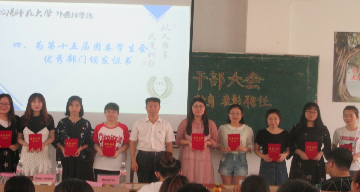 王艳彪老师为十五届团委员工会“优秀部门”颁发证书