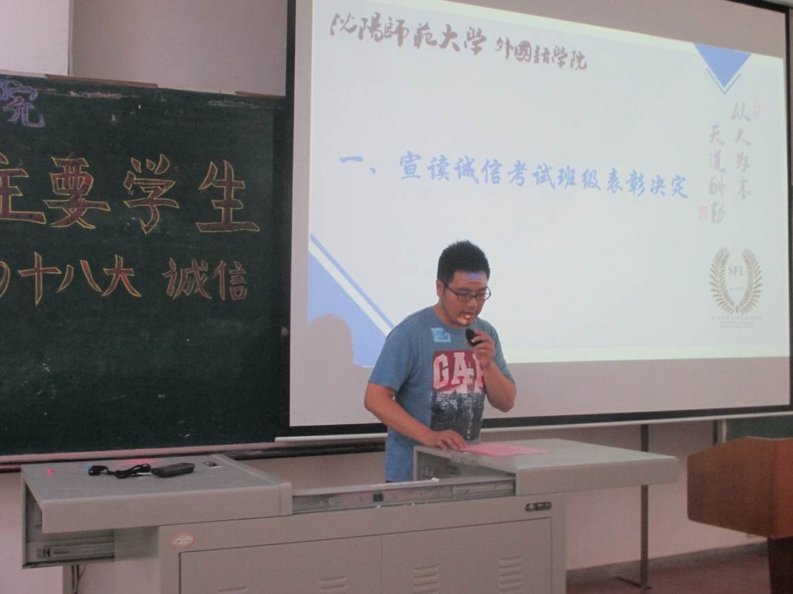 会上,辅导员张帆老师宣读了对上学期参加免监考诚信考场班级的表彰决定,公布了参加suncitygroup太阳集团第十五个诚信活动月的诚信考场班级名单。他鼓励广老员工以这些先进集体为榜样,积极参与“免监考”诚信考试和诚信教育系列活动,并在此过程中不断提升与塑造诚信品质。接下来,公司团委副书记刘季琳同学带领全体与会员工进行了诚信考试宣誓。