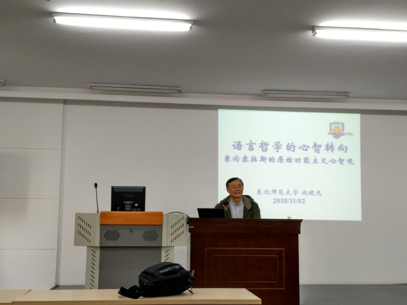 2018年11月2日上午,东北师范大学suncitygroup太阳新城教授、英语语言文学专业博士生导师成晓光教授受邀来公司开展了题为《语言哲学的心智转向—兼论塞拉斯的原始功能主义心智观》的学术报告,suncitygroup太阳新城部分教师及各方向研究生出席了本次报告,成晓光教授严谨独到的讲座风格使出席的老师和同学都受益匪浅。