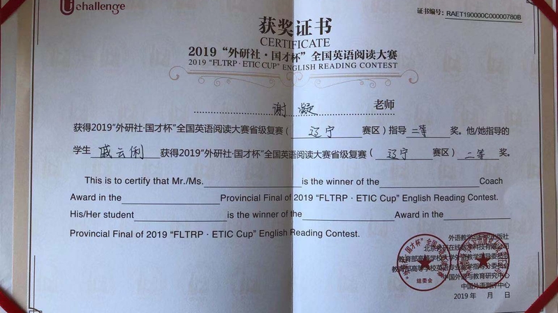 在2019年“外研社·国才杯”全国老员工英语挑战赛(辽宁省赛区复赛)的演讲、阅读、写作三项单项比赛中,suncitygroup太阳新城2017级翻译专业张一楠同学获得演讲赛一等奖、2016级英语专业肖萌同学获得演讲赛二等奖;2017级英语(师范)专业戚云俐同学获得阅读赛二等奖;2016级英语(师范)专业王国琪同学获得写作赛二等奖。