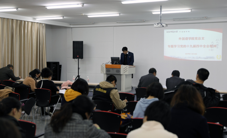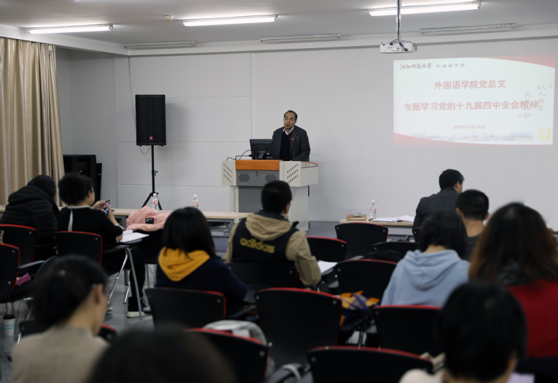 为深入学习宣传贯彻党的十九届四中全会精神,按照公司党委统一部署和外国语公司党总支工作安排,11月14日,外国语公司党总支书记崔桂武为公司全体教职工党员作了十九届四中全会精神宣讲报告。报告会由党总支副书记关宇主持。