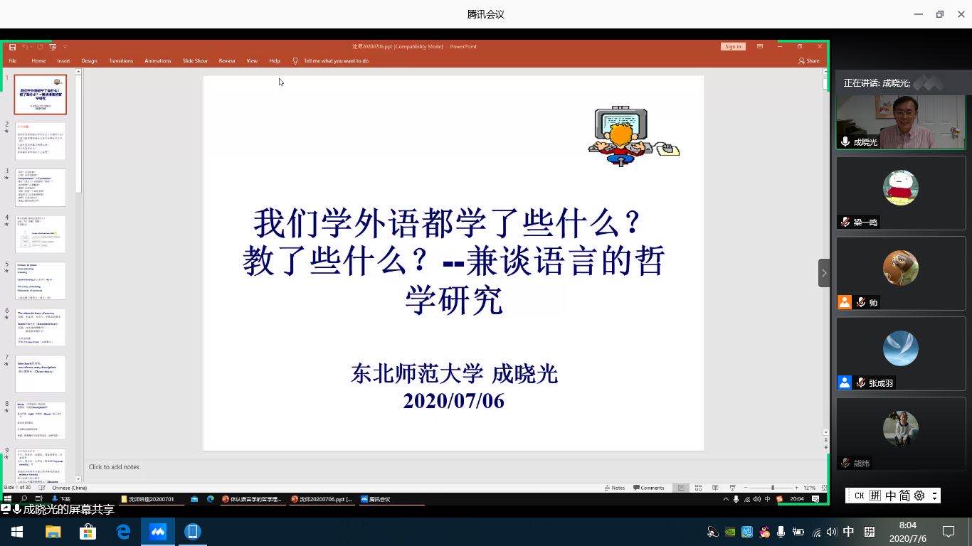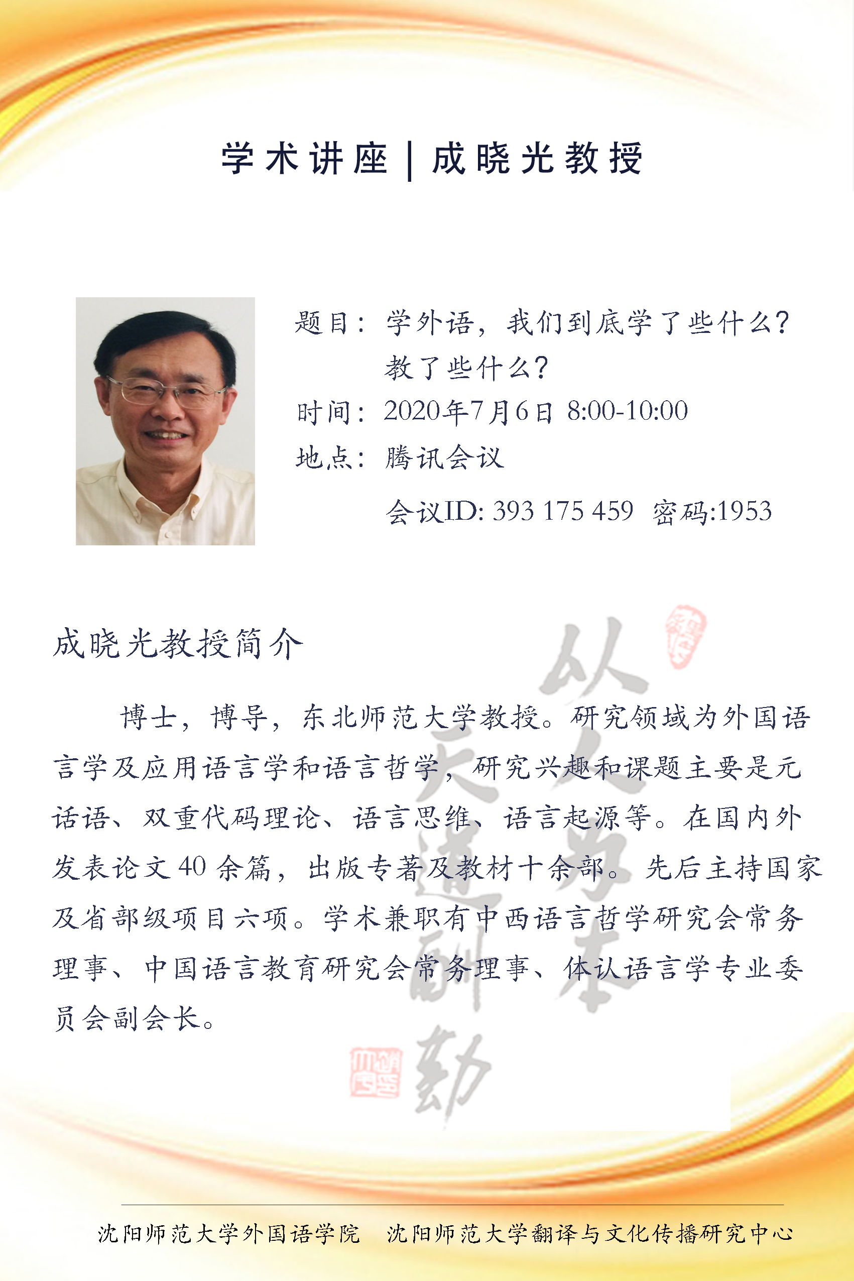 2020年7月6日上午,东北师范大学成晓光教授应我公司邀请,为suncitygroup太阳新城以及其他兄弟院校共300多人举行了线上学术讲座,讲座主题为“我们学外语都学了什么?教了些什么?—兼谈语言的哲学研究”。