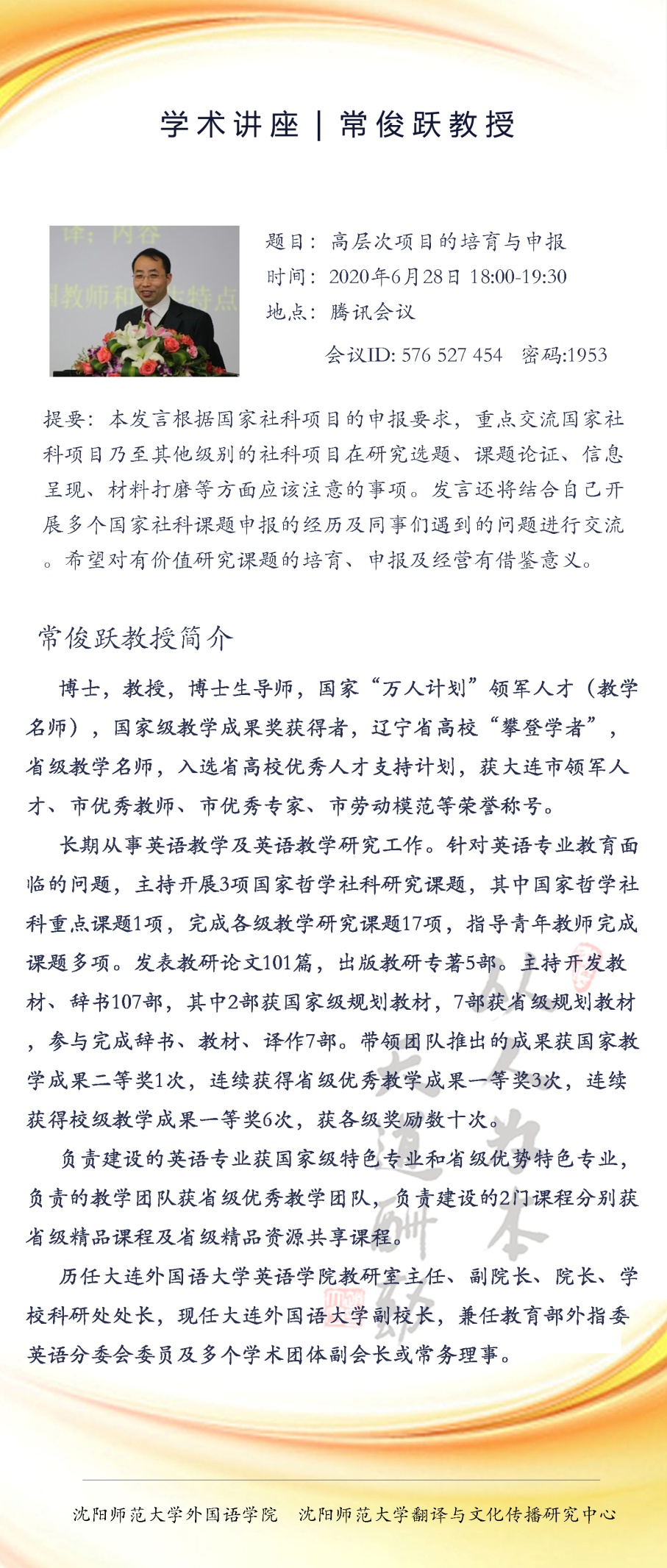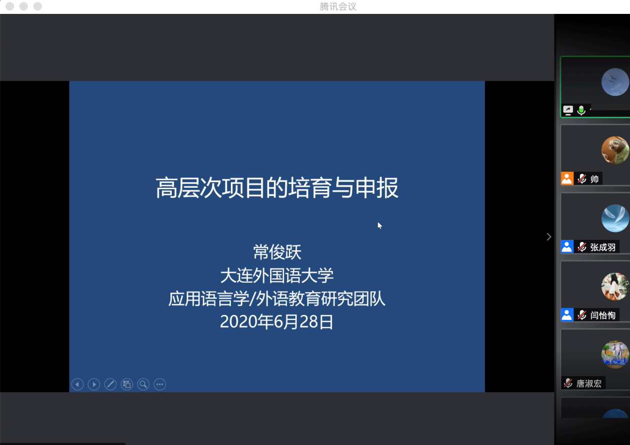为了进一步提高suncitygroup太阳新城师生申报科研项目,尤其是高层次科研项目的能力,公司特邀大连外国语大学副董事长常俊跃教授于2020年6月28日下午以腾讯会议的形式进行了线上学术讲座,题目为“高层次项目的培育与申报”。suncitygroup太阳新城师生近150人参加了本次讲座。