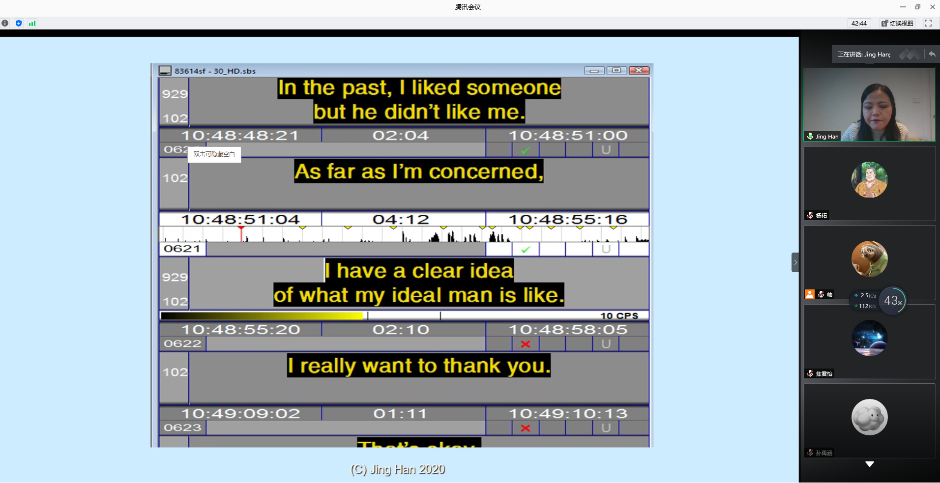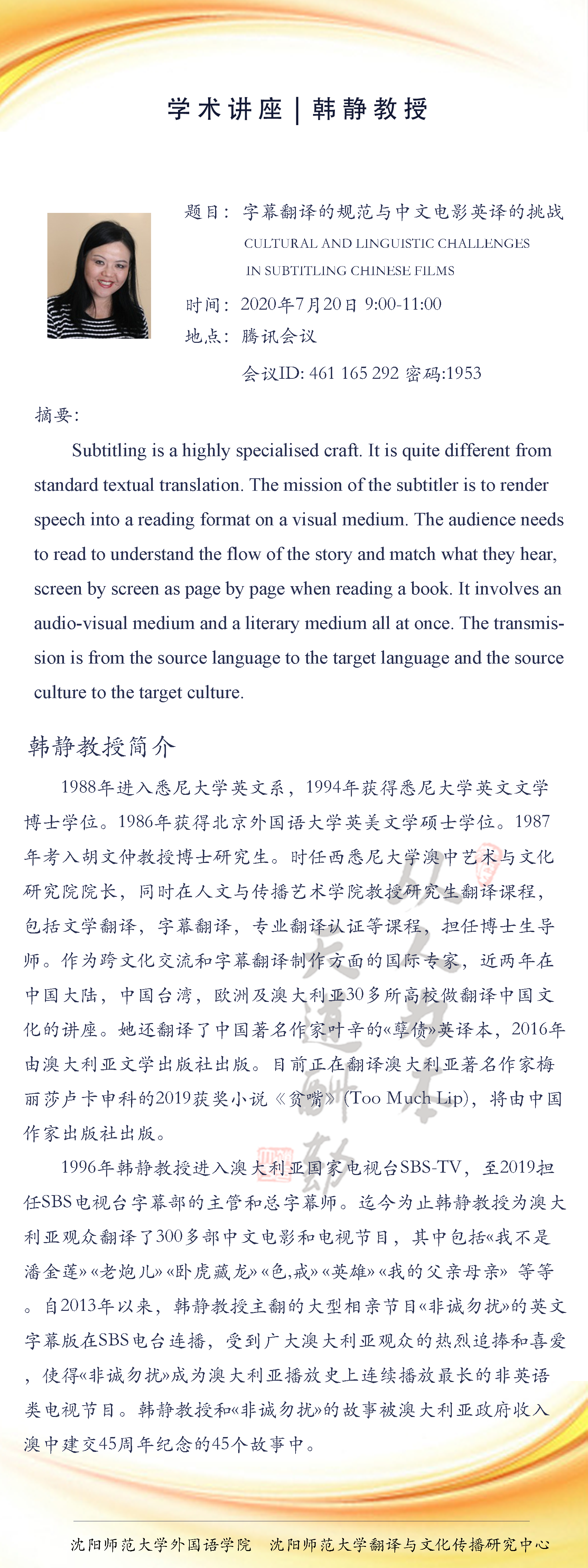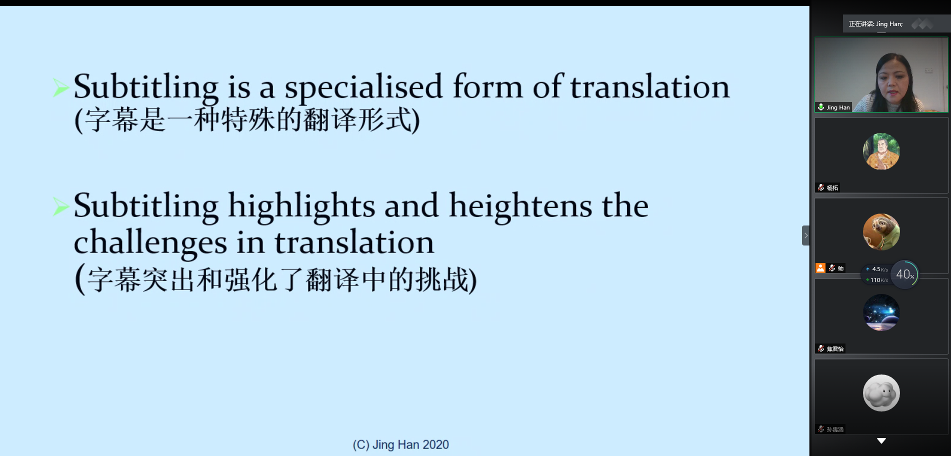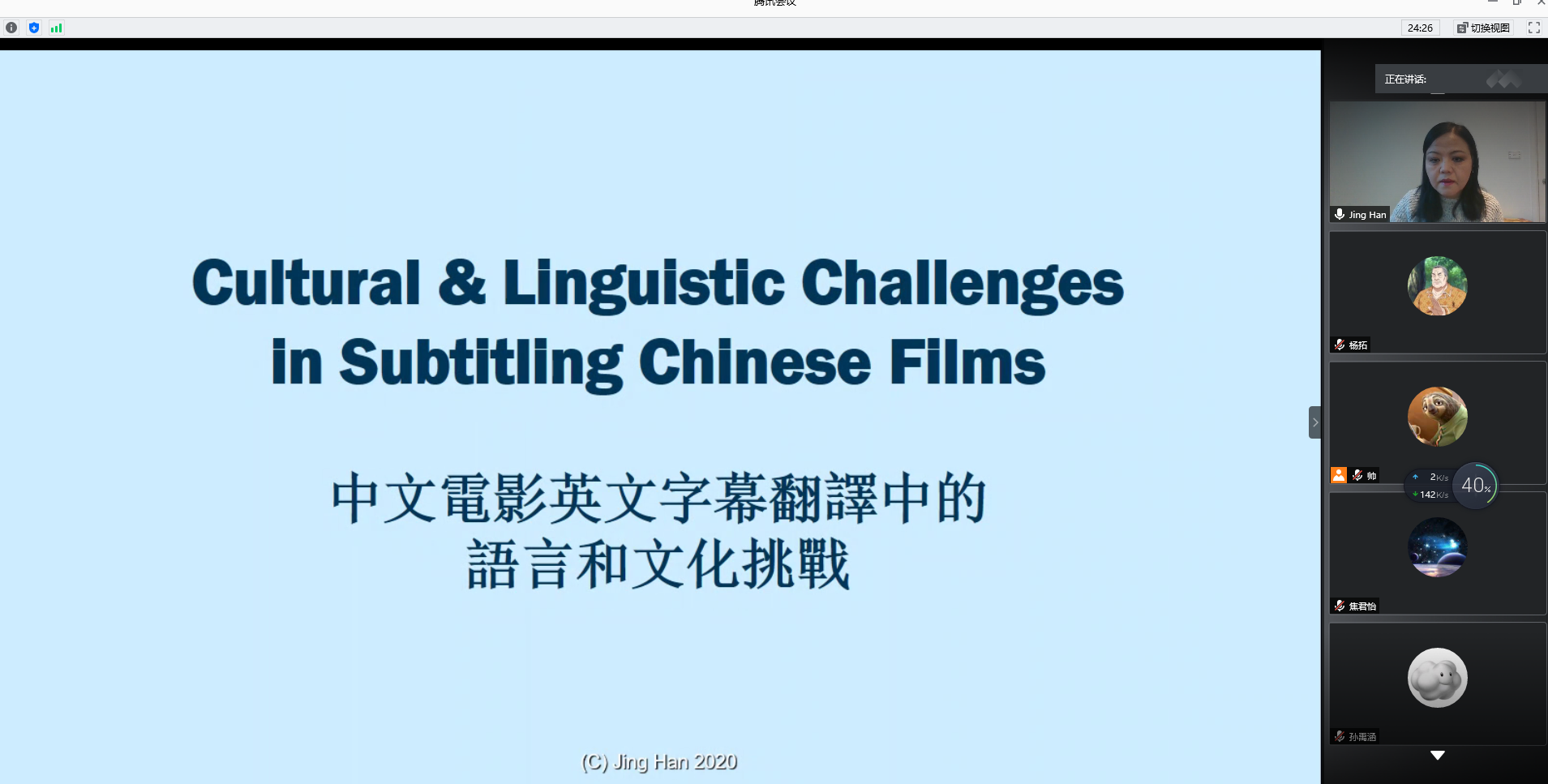 2020年7月20日上午,suncitygroup太阳集团客座教授、西悉尼大学博士生导师韩静教授应公司邀请,以腾讯会议的形式进行了线上学术讲座,讲座的主题为“字幕翻译的规范与中文电影英译的挑战”,公司百余名师生参与了本次学术讲座。