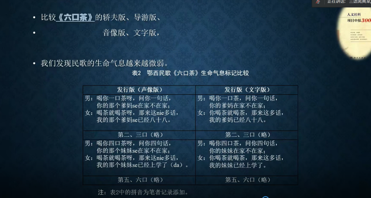 其次,黄教授以生动的本、硕、博论文指导和自身科研经历,向大家介绍科研的几个阶段。他提出,科研首先需要观察充分,观察是研究的开端,旨在捕捉现象,寻找研究的WHAT。在观察充分后,科研者需要描写充分,其旨在揭示规律,来寻找事物的HOW。之后,研究者需要分析充分,通过实事求是,来培养批判性思维。最后一个阶段为研究的解释充分,旨在阐释规律,寻找事物的WHY,是研究的高级层面。黄教授通过播放湖北民歌,生动形象地来他展示通过以上四阶段,将日常生活升华为科研成果的个人经验。