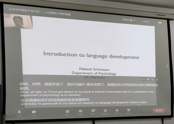 本次讲座带领同学们探究儿童是如何习得语言的基本发音、语法规则等有关语言的方方面面的。首先,Mahesh Srinivasan教授解释了研究语言起源的重要性,并提出了语言习得的主要四个阶段。解答员工相关问题后,Mahesh Srinivasan教授引入先天主义假设、行为主义理论、认知革命等概念,并探讨环境在语言发展中的作用、语言习得的关键时期。最后,Mahesh Srinivasan教授进一步拓展介绍了有关语言能力发展的各个方面,包括语音的感知、单词的学习、语法的发展等。也讨论了一些国际前沿有趣的的话题,如先天和后天如何在语言习得中相互作用,儿童是否比成人更擅长学习语言,其他动物是否能够使用语言,以及儿童同时学习多种语言的后果等。讲座过程中,Mahesh Srinivasan教授针对同学提出的问题,进行了实时且详细的解答。
